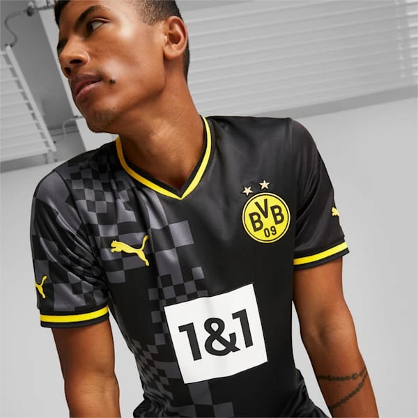Bring the noise. Home and away come together in the 2022/23 Borussia Dortmund Away kit. The jersey pays tribute to the most passionate fans in the game, featuring tonal graphics inspired by flags and banners that light up the stands every time BVB play, no matter where or when – and no matter what. Heja BVB!